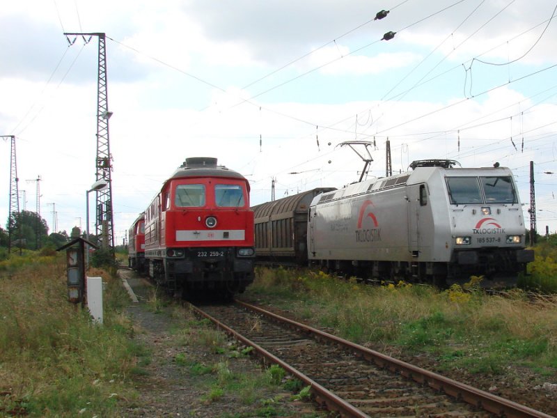 232 259-2 und 232 519-9, daneben fährt 185 537-8 von TXL vorbei am 23.08.2008 in Großkorbetha