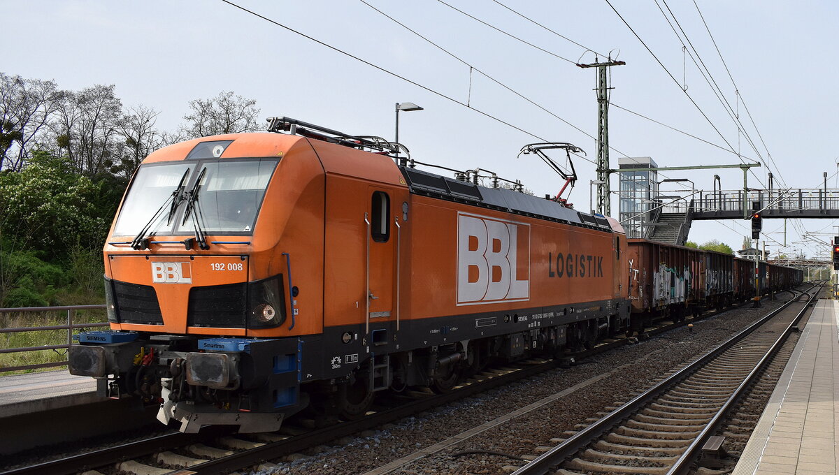 BBL Logistik GmbH, Hannover [D]  mit ihrer Smarton  192 008  [NVR-Nummer: 91 80 6192 008-1 D-BBL] und einigen Hochbordwagen und hintendran die BUVL MaG G 1206 (NVR:  92 80 1276 045-2D-BUVL ) am Haken am 08.04.24 Durchfahrt Bahnhof Roßlau (Elbe).