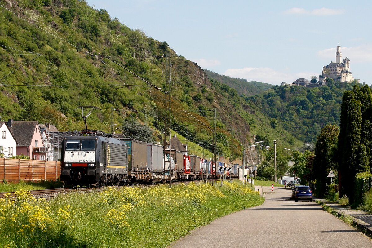 PKP CARGO S.A., Warszawa [PL] mit ihrer "EU46-510" [NVR-Nummer: 91 51 5370 022-3 PL-PKPC] und einem Ganzzug Containertragwagen (leer) Richtung Polen am 06.05.24 Höhe Bahnhof Frankfurt/Oder.