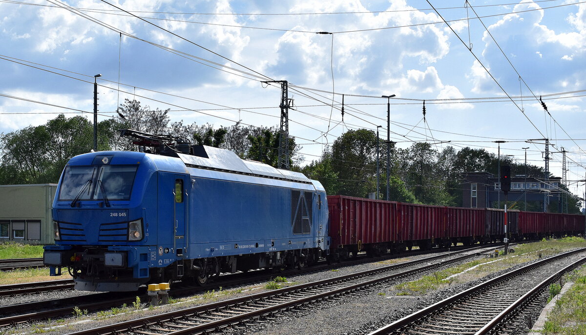 dispo-Tf Rail GmbH, Berlin [D] mit der Vectron Dual Lok  248 045  [NVR-Nummer: 90 80 2248 045-7 D-NRAIL] mit einem Ganzzug Hochbordwagen fährt im Bahnhof Eilenburg ein um umzusetzen, 02.05.24
