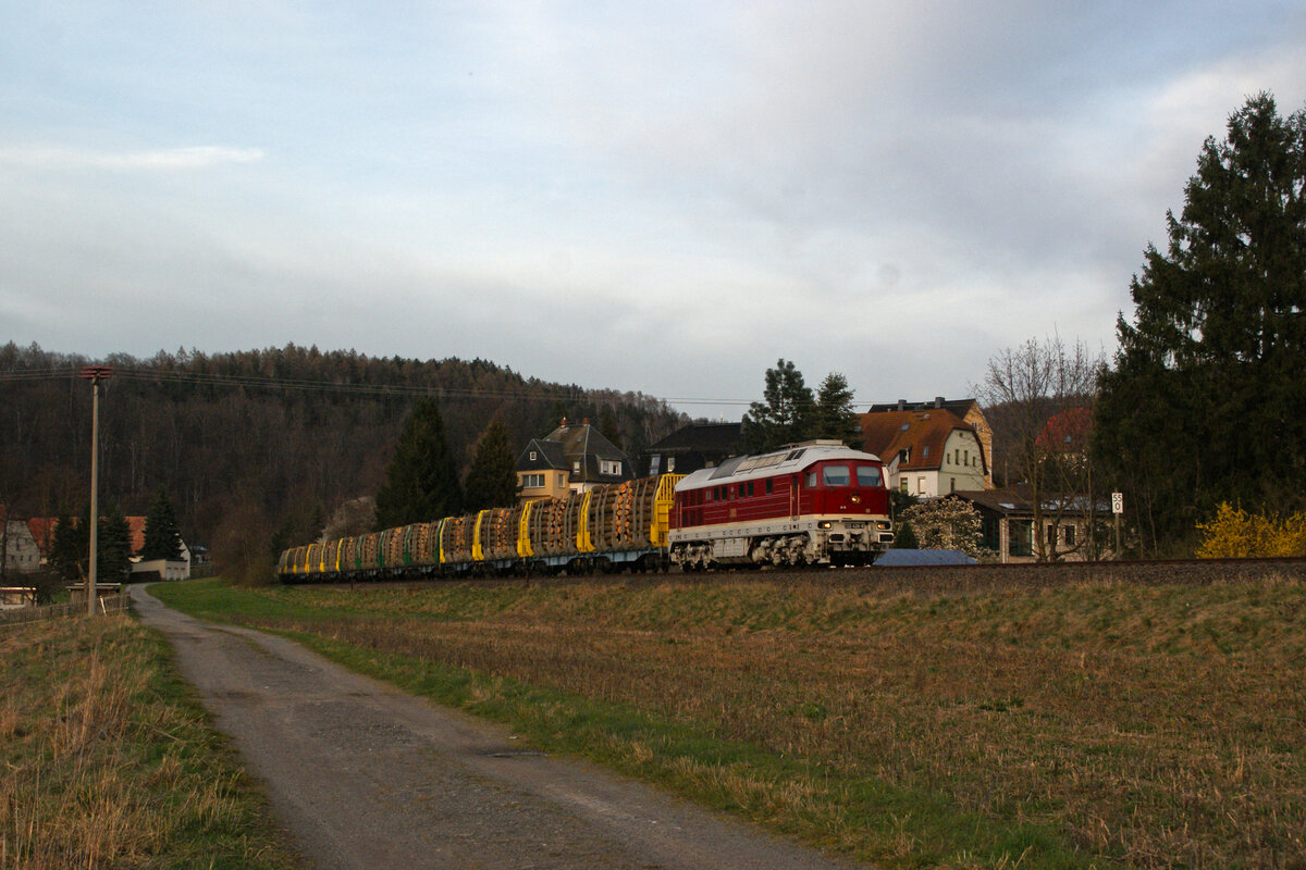 Vierachsiger Flachwagen für den Transport von Holzstämmen mit der Bezeichnung "Snps 2" (37 80 4725 040-6 D-ERR), gezogen von 187 316-5 in Braschwitz Richtung Halle (Saale).