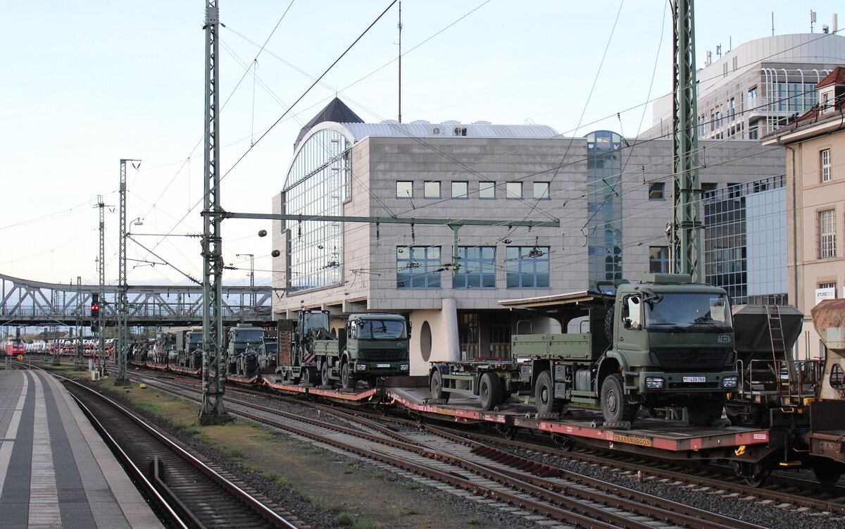 DB Cargo mit Drehgestellflachwagen mit vier Radsätzen, mit Stirnwandklappen, ohne Seitenborde und mit Rungen der Wagengattung Rmms 664, beladen mit einachsigen Militärhängern in einem Militärtransportzug am 15.10.24 Höhe Bahnhof Magdeburg Neustadt. Lothar Stöckmann