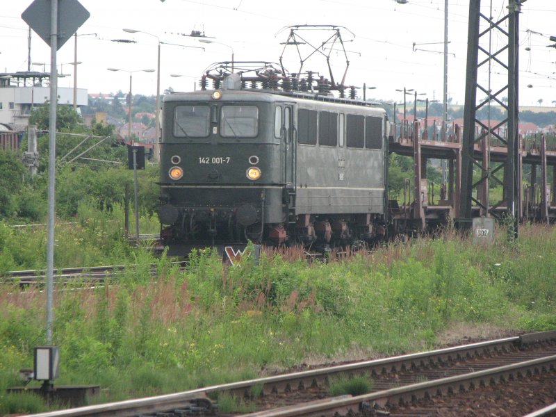 142 001-7 fuhr mit ihrem Güterzug aus Richtung Coswig komment durch den Dresdner Güterbahnhof um ihn nach Bad Schandau zu bringen.29.06.07 Matthias Mohr