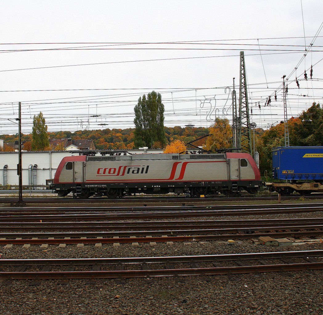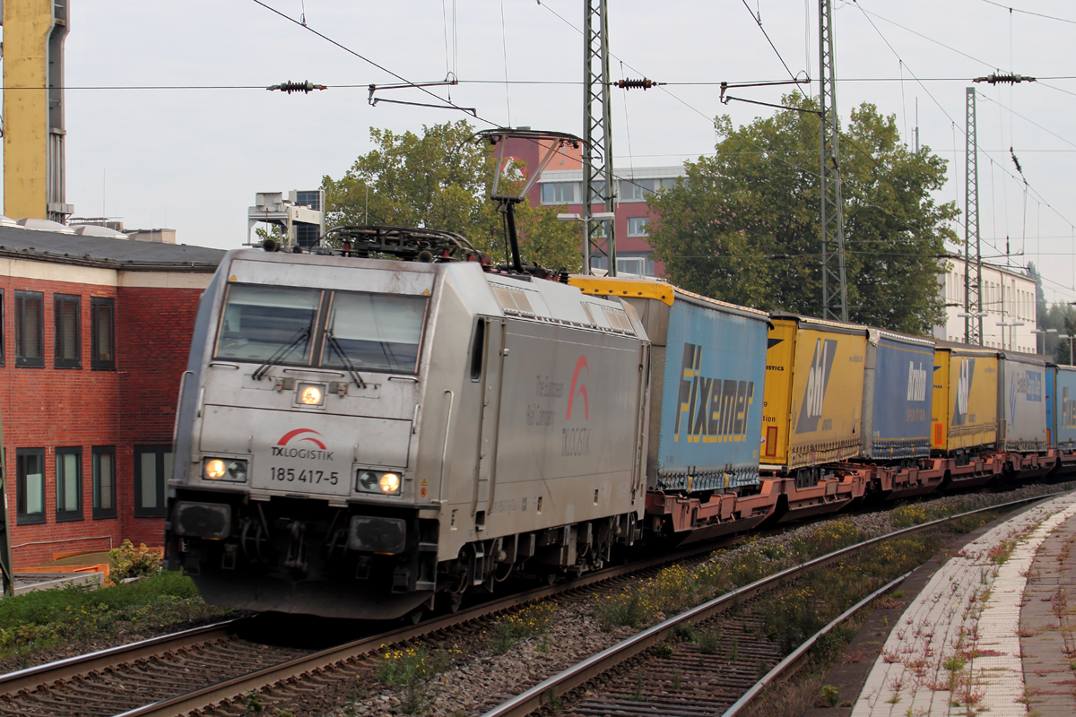 185 597-2 von Crossrail l kommt aus Richtung Köln,Aachen-Hbf,Aachen-Schanz mit einem LKW-Walter-Zug aus Novara(I) nach Genk-Goederen(B) und fährt in Aachen-West ein. Aufgenommen vom Bahnsteig in Aachen-West.