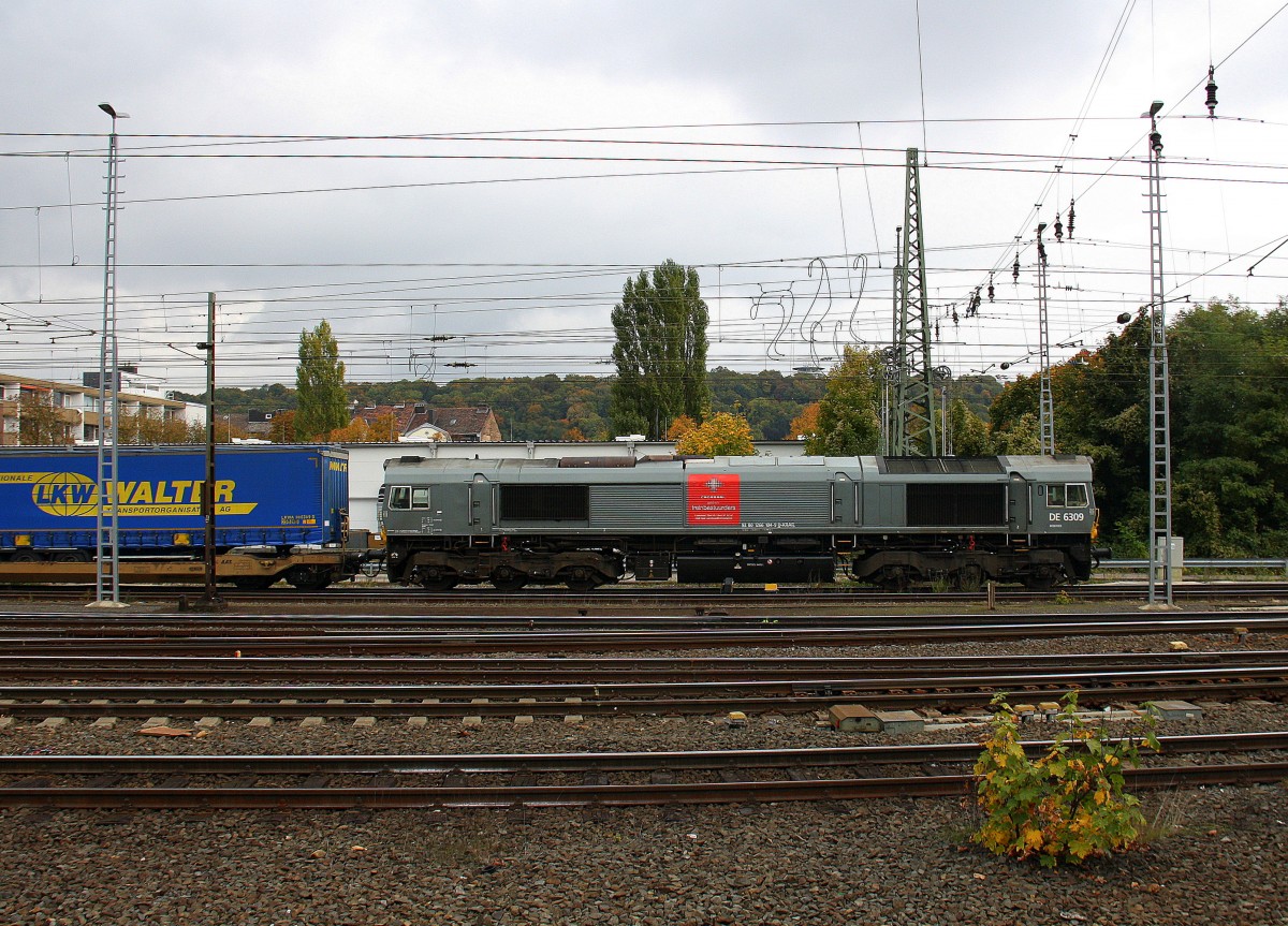 Die Class 66 DE6309 von DLC Railways fährt mit viel Dieselpower mit einem langen LKW-Walter-Zug aus Novara(I) nach Genk-Goederen(B) bei der Ausfahrt aus Aachen-West in Richtung Montzen/Belgien.