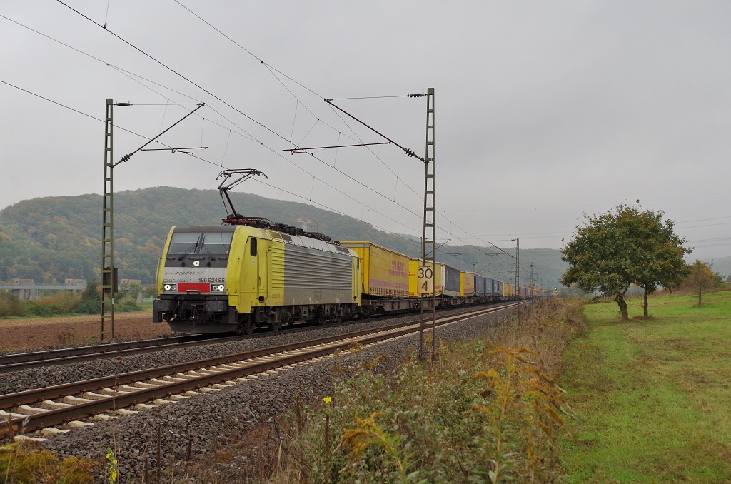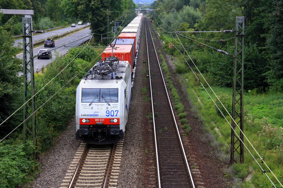189 907 Lokomotion kommt aus Richtung Koblenz mit einem langen EKOL-LKW-Zug aus Triest(I) nach Köln-Eifeltor und fährt in Richtung Köln auf der Rechten Rheinstrecke (KBS 465) bei Bad-Honnef am Rhein bei Sommerwetter am 15.8.2013. Stefan Hochstetter