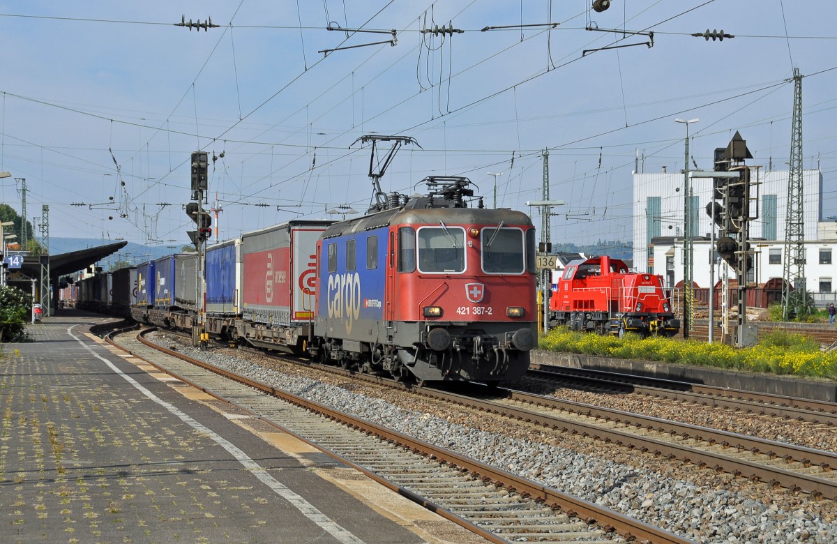 421 387 der SBB kommt mit einem KLV südwärts durch den Bahnhof Neuwied.Im Hintergrund steht eine Gravita die 261 078 und wartet auf neue Aufgaben.Aufgenommen am 2.10.2013 Daniel Powalka