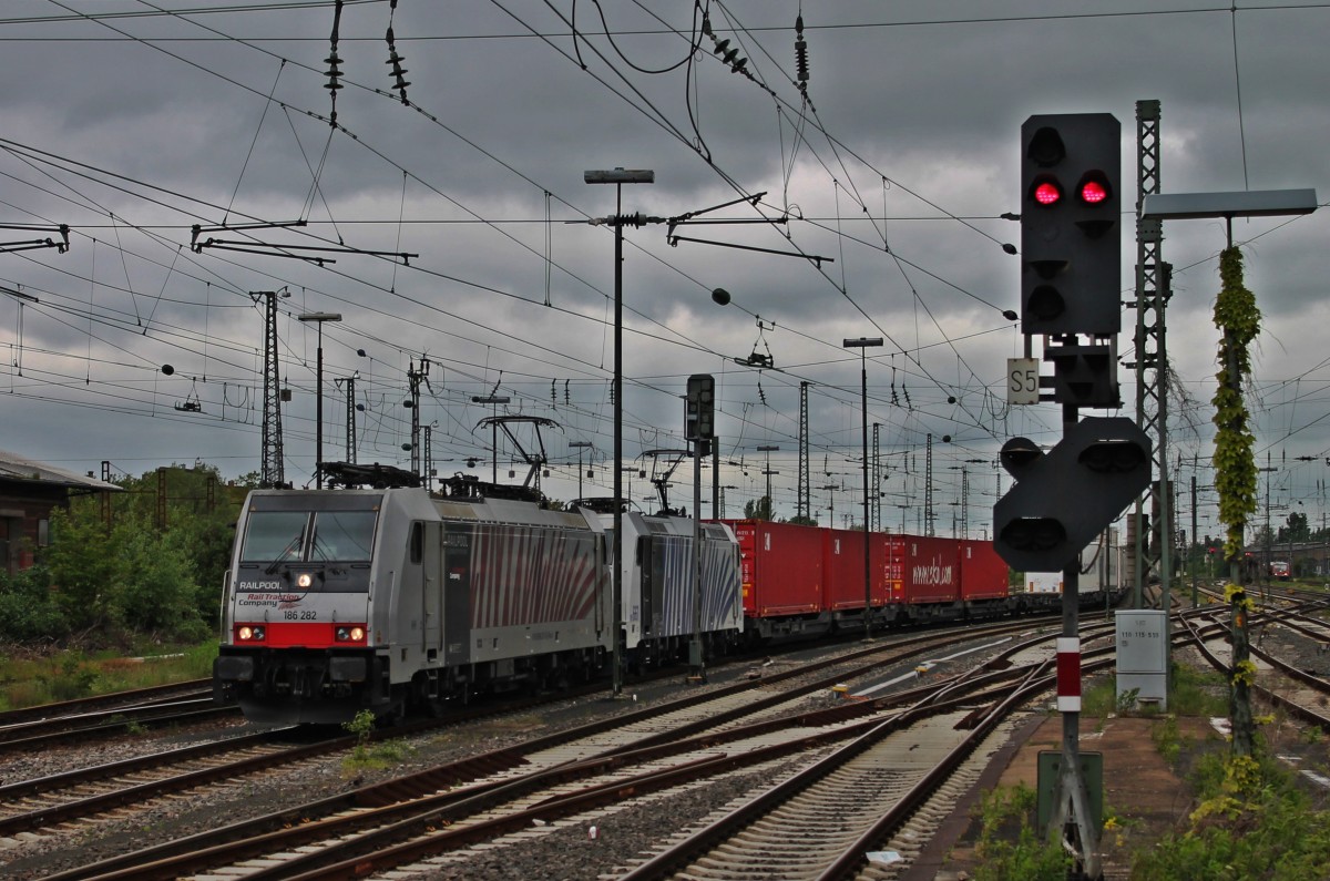 Zwei Zebras in Worms: Railpool/Lokomotion 186 282-0 stand zusammen mit Lomo 185 661-6 "Paul" und dem ekol.com KLV im Wormser Rbf und warteten auf die Weiterfahrt in Richtung Süden. Tobias Schmidt