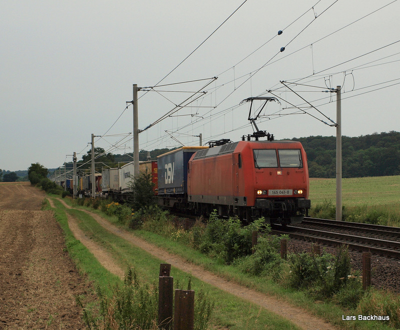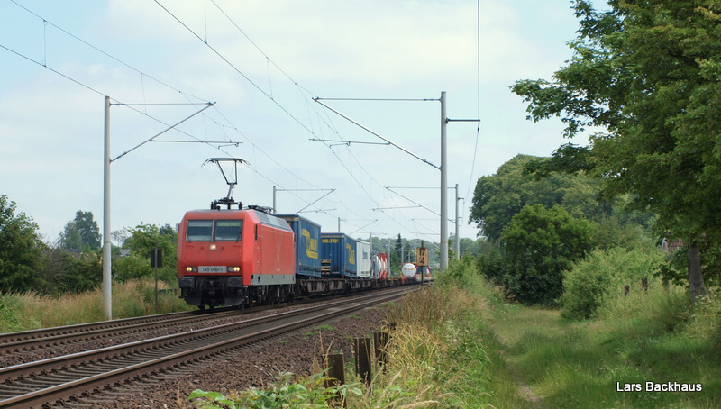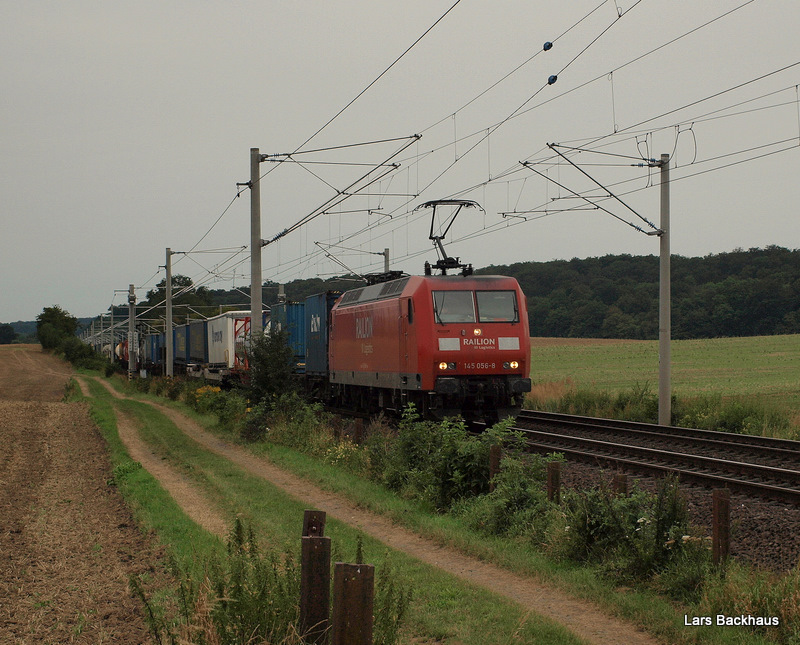 145 056-8 poltert am Morgen des 15.08.09 einem Kombizug nach Lübeck-Skandinavien durch die weite Feldlandschaft vor Reinfeld (Holst.) Richtung Lübeck.