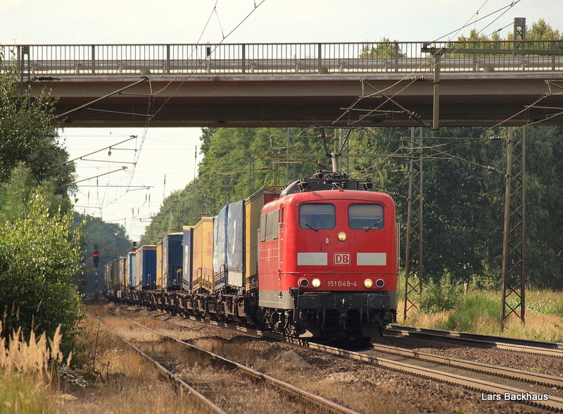 151 049-4 poltert am 15.08.09 mit einem Kombizug aus Lübeck-Skandinavienkai durch Radbruch Richtung Süden.