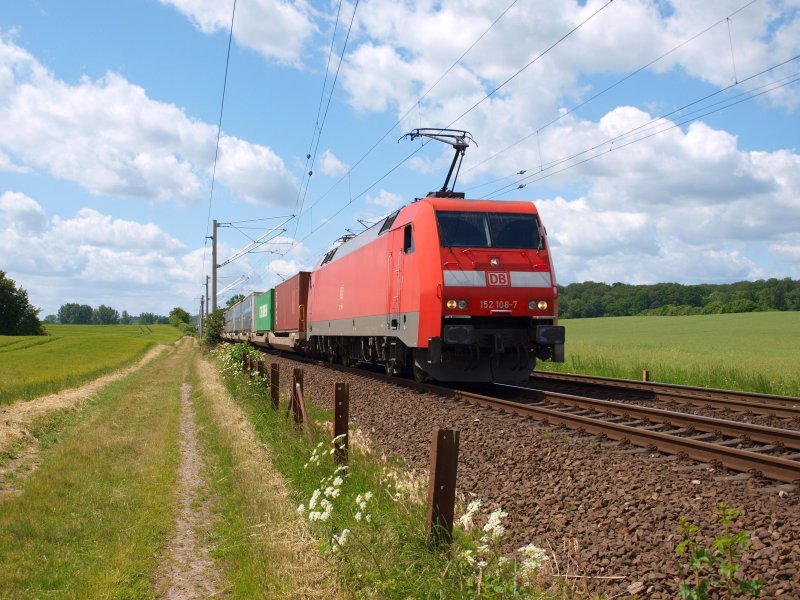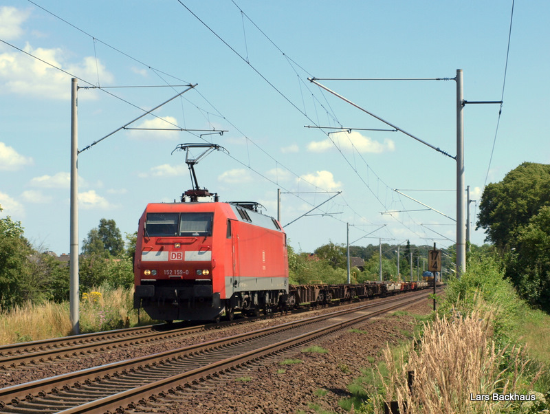 152 159-0 hat am 16.07.09 einen fast leeren KLV-Zug Richtung Hamburg am Haken und hat soeben Reinfeld (Holst.) Richtung Bad Oldesloe durchfahren.
