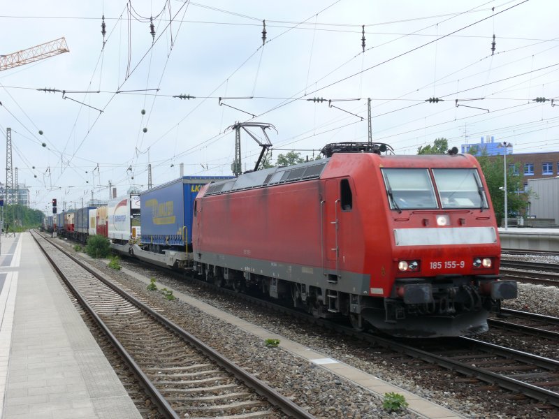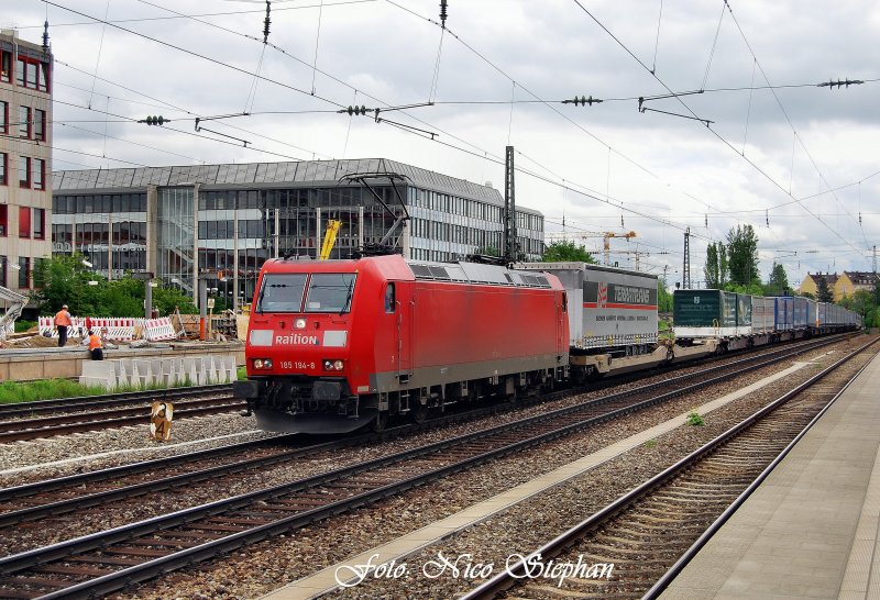 185 194-0 kommt mit einem Sattelaufliegerzug durch den Münchner Heimeranplatz gefahren (Bahnbildertreffen 16.05.09)