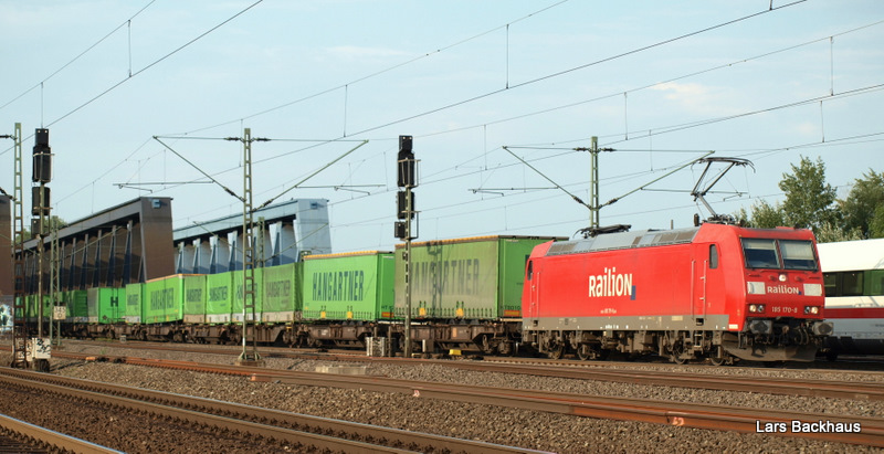 185 170-8 rollt am 20.08.09 mit einem Hangartner KV-Zug über die Süderelbbrücken Richtung Rangierbahnhof Maschen.