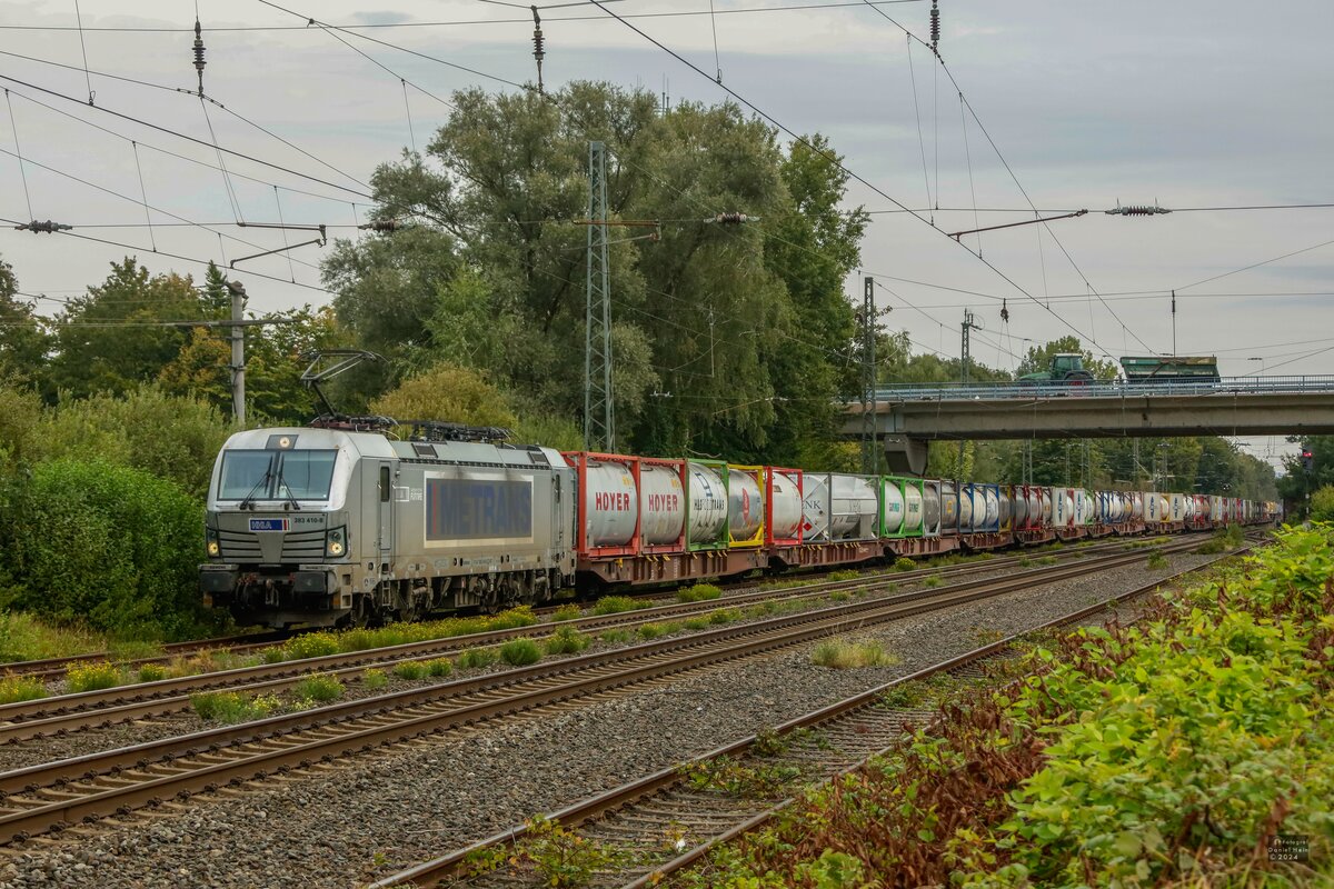 HSL Logistik GmbH, Hamburg-Tiefstack [D] mit der Akiem Lok "186 365-3" [NVR-Nummer: 91 80 6186 365-3 D-AKIEM] und einem KLV-Zug am 05.09.24 Durchfahrt Bahnhof Magdeburg-Neustadt.