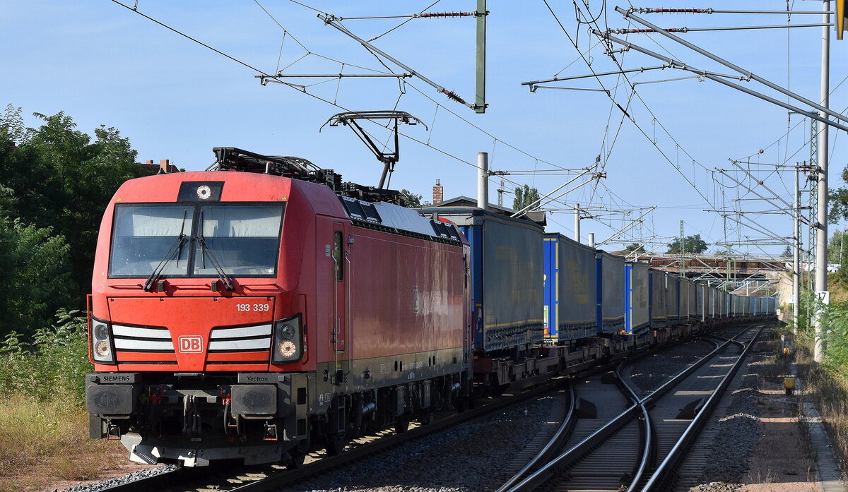 DB Cargo AG, Mainz mit ihrer   193 339  [NVR-Nummer: 91 80 6193 339-9 D-DB] und einem KLV-Zug am 02.09.24 Höhe Bahnhof Roßlau (Elbe).