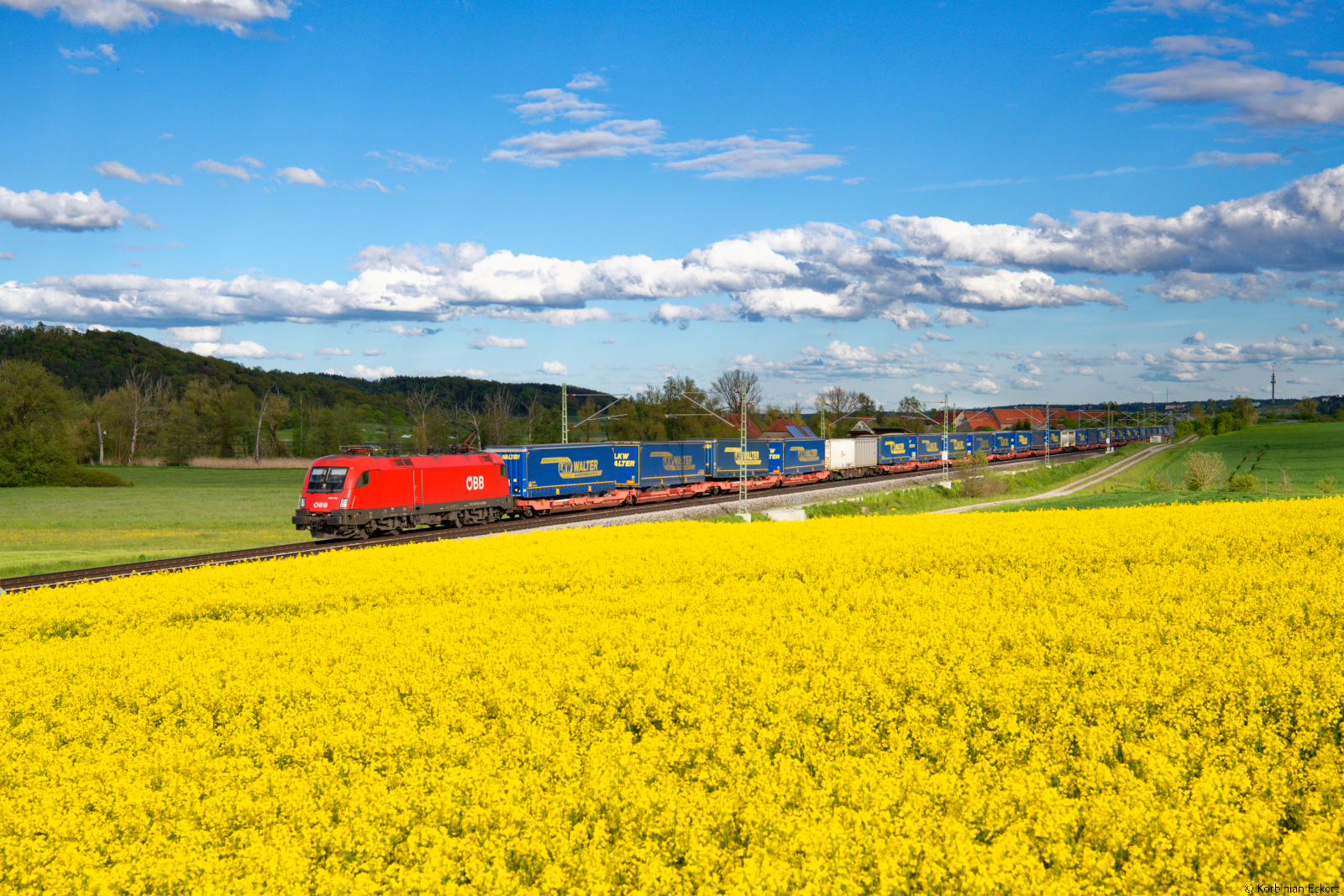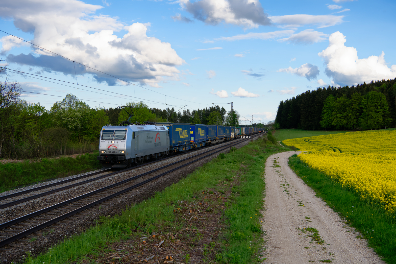 Am 13.07.2024 zieht 91 80 6193 774 gemeinsam mit einer weiteren 193 einen KLV-Zug durch den Bahnhof Aßling Richtung München. Ursprünglich fuhr die Maschine mit den markanten Lokomotion-Zebrastreifen, seit 2022 ist sie mit der hier zu sehenden Gestaltung für 20 Jahre Lokomotion unterwegs.