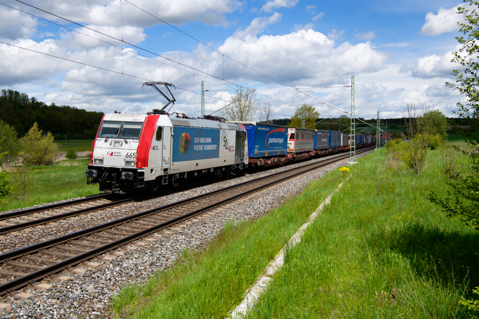 Mittlerweile seit fast 15 Jahren steht 91 80 6185 665 in Diensten von Lokomotion. Interessanterweise trägt die Maschine eine zweisprachige Werbung: Während auf der hier zu sehenden  deutschen  Seite die perfekte Kombination aus LKW und Bahn zum 50. Jubiläum des Kombiverkehrs beworben wird, ist die andere Seite des Lokkastens mit demselben Slogan in englischer Sprache beschriftet. Die Aufnahme am Münchener Heimeranplatz datiert vom 05.04.2024.