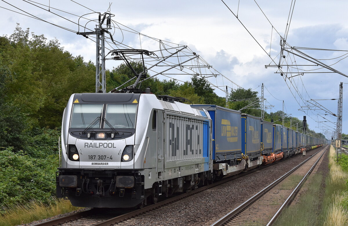 HSL Logistik GmbH, Hamburg [D] mit der Railpool Lok "187 307-4" [NVR-Nummer: 91 80 6187 307-4 D-Rpool] und einem KLV-Zug aus Rostock Seehafen am 04.07.24 Höhe Bahnhof Berlin-Hohenschönhausen. Lothar Stöckmann