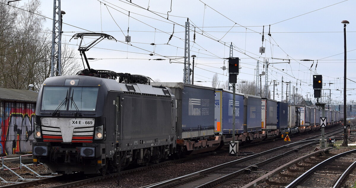 LTE Logistik und Transport GmbH, Graz [D] mit der BRCE Vectron "X4 E - 669" [NVR-Nummer: 91 80 6193 669-9 D-DISPO] und KLV-Zug Richtung Frankfurt/Oder weiter nach Polen am 26.03.24 Höhe Bahnhof Berlin-Hirschgarten. Lothar Stöckmann