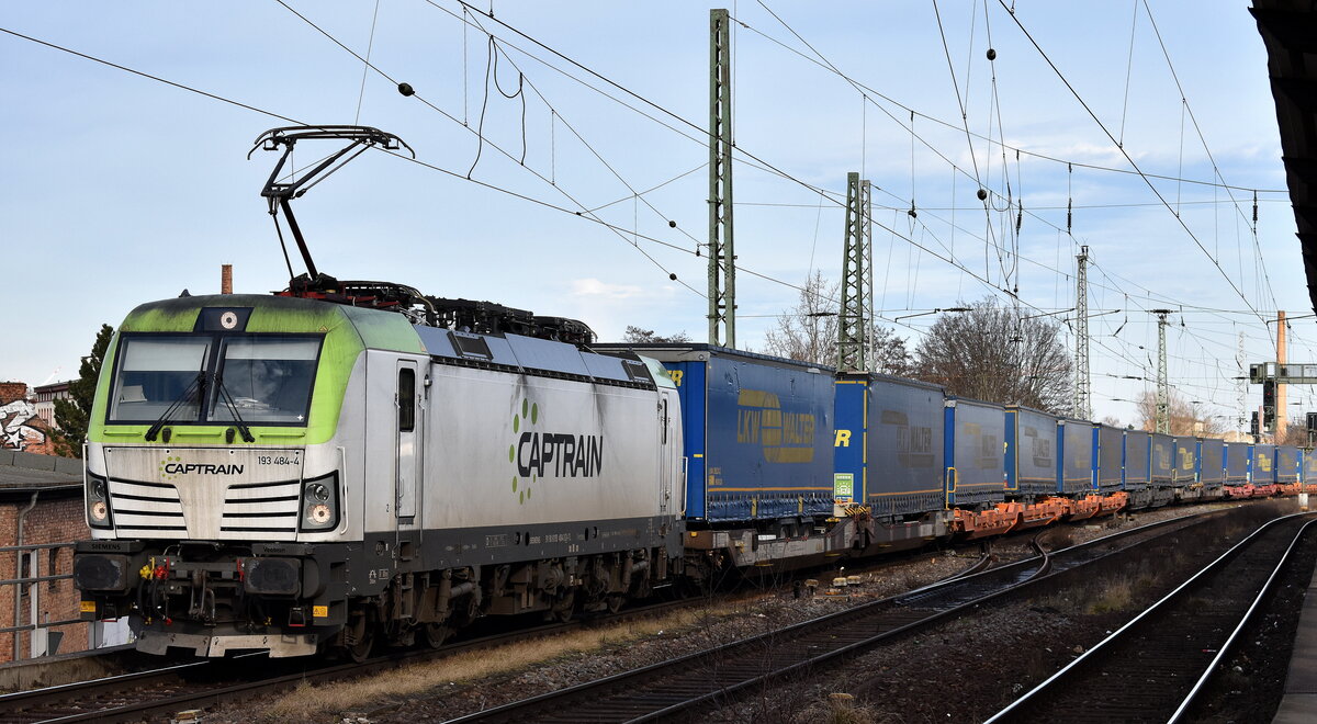 ITL - Eisenbahngesellschaft mbH, Dresden [D] mit ihrer "193 484-3" [NVR-Nummer: 91 80 6193 484-3 D-ITL] und einem KLV-Zug am 29.01.24 bei der Vorbeifahrt Bahnhof Magdeburg Neustadt.