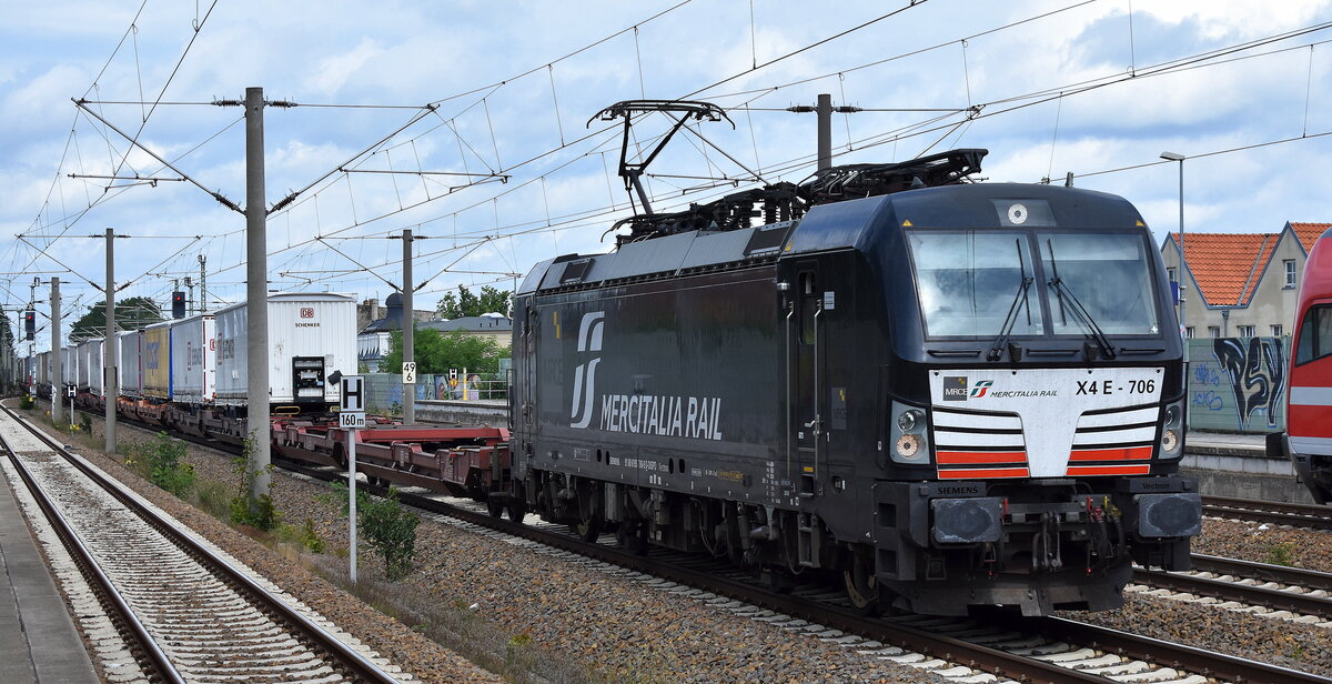 DB Cargo AG [D] / Mercitalia Rail S.r.l., Roma [I] mit der MRCE Vectron "X4 E - 706" [NVR-Nummer: 91 80 6193 706-9 D-DISPO] und KLV-Zug am 01.08.23 Höhe Bahnhof Luckenwalde. Lothar Stöckmann