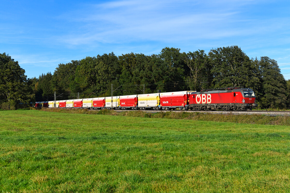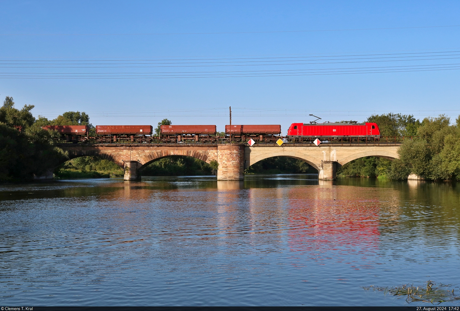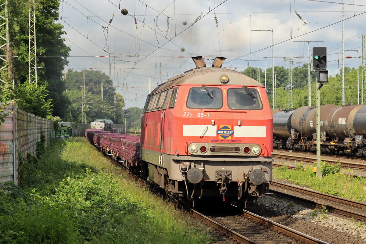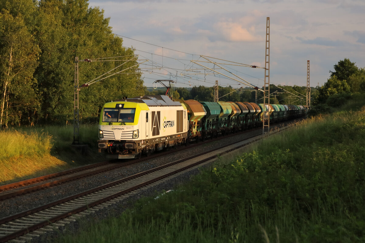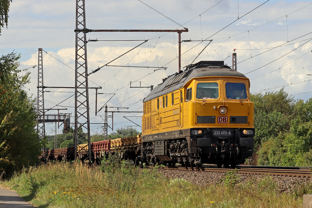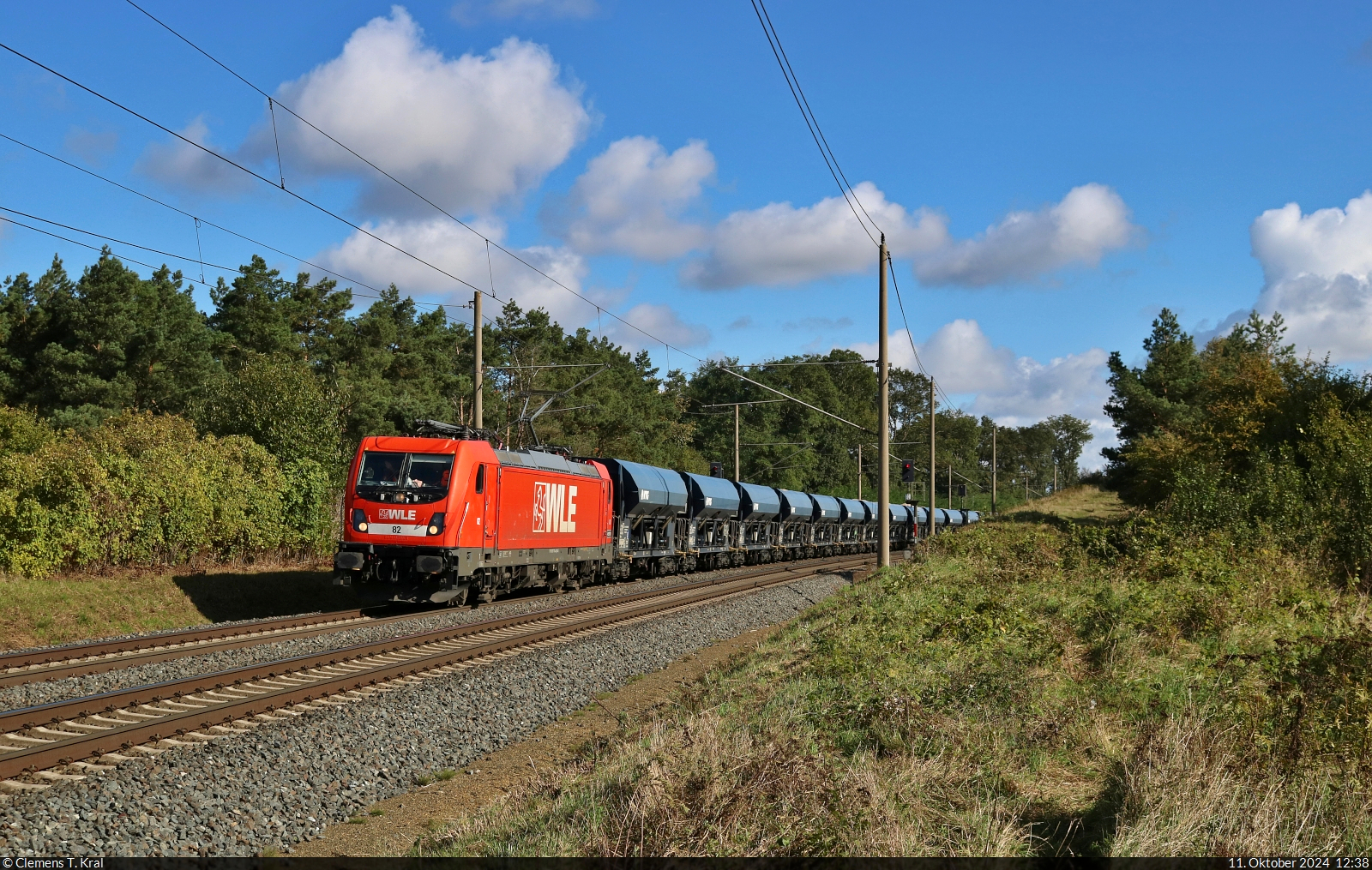 152 094-9 (NVR-Nummer: 91 80 6152 094-9 D-DB) am Bahnübergang Goethestr. in Dabendorf in Richtung Berlin mit einem Ganzzug Schüttgutkippwagen sowie 152 155-8 (NVR-Nummer: 91 80 6152 155-8 D-DB) (kalt) am 20. Juli 2025 Klaus-P. Dietrich