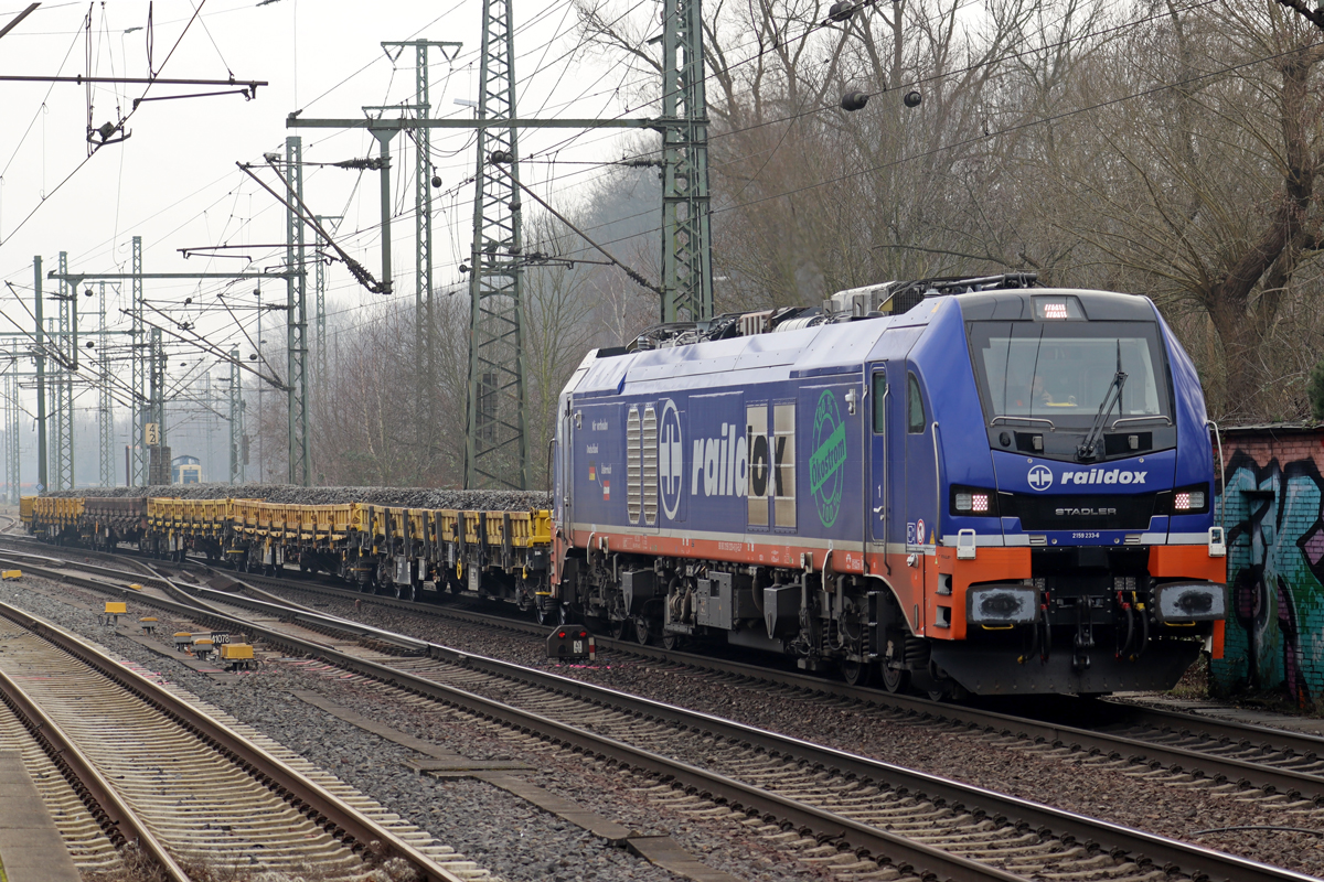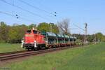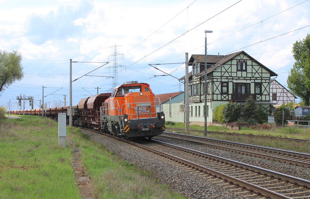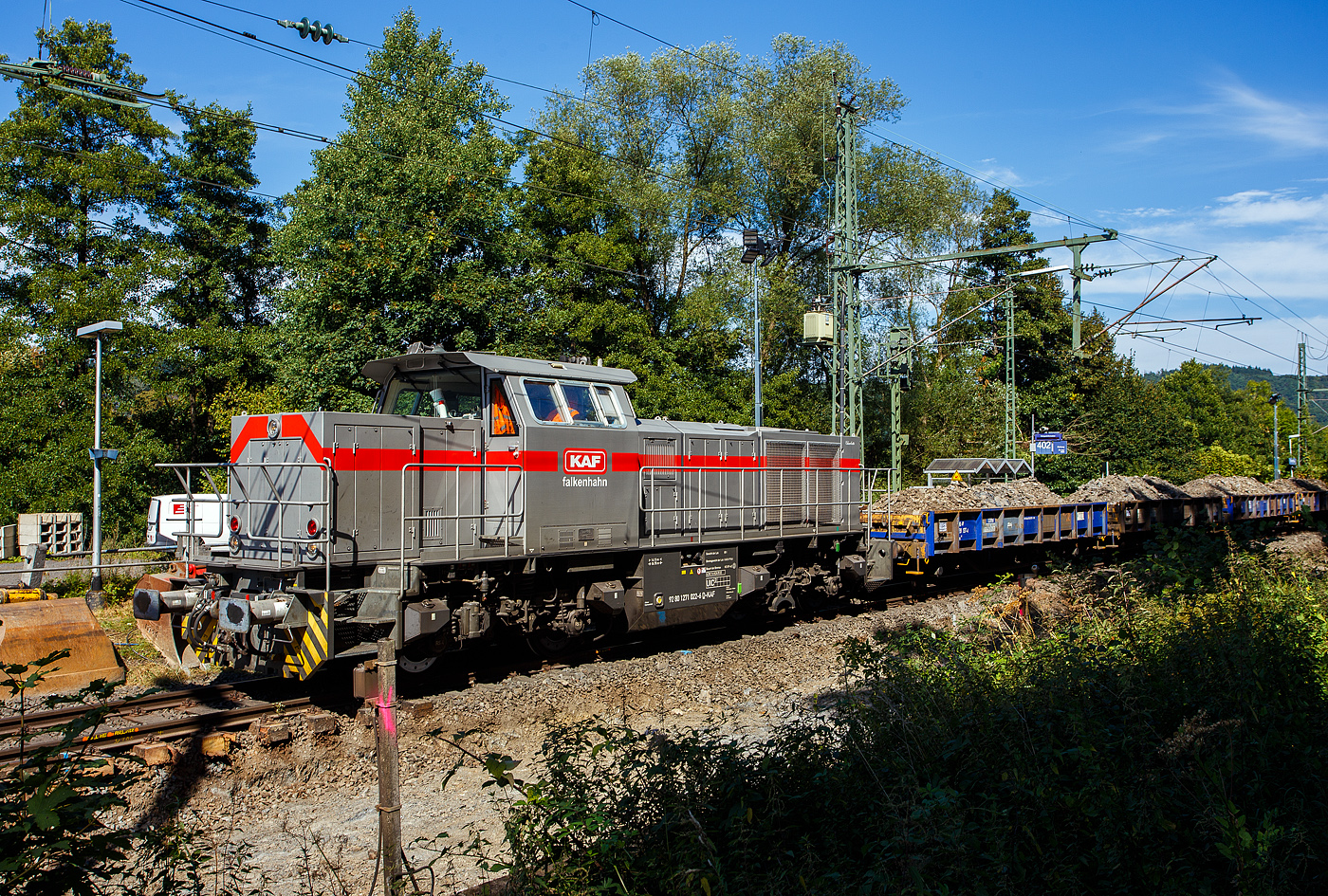 Die 271 022-6 „Charlotte“ (92 80 1271 022-6 D-KAF) eine Vossloh/MaK G 1000 BB der KAF Falkenhahn Bau AG. ex MRCE bzw. ex HGK DH 49, am 26 August 2025 mit einem mit Aushub beladenen Niederbordwagen-Zug (zweiachsiger Flachwagen NS Gattung Klmos 702 der Vermietungsfirma Railpro), bei der Baustelle im Bf Scheuerfeld/Sieg.