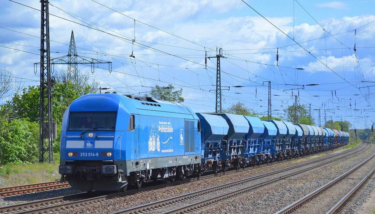 Eisenbahn-Bau- und Betriebsgesellschaft Pressnitztalbahn mbH, Jöhstadt [D] mit "253 014-9" (NVR: "92 80 1223 051-4 D-PRESS") und einem Schotterzug mit fast vollständig blauen betriebseigenen Schotterwagen, einfach mal ein fotogener Güterzug am 05.05.20 Bf. Saarmund. Lothar Stöckmann