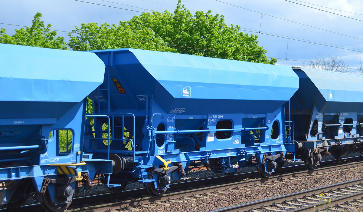 PRESS mit einem Schüttgutwagen mit dosierbarer Schwerkraftentladung mit österreichischer Registrierung mit der Nr. 21 RIV 81 A-PRESS 6453 053-5 Fcs 091 in einem Schotterzug am 05.05.20 Bf. Saarmund. Lothar Stöckmann