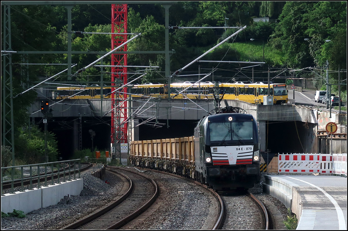 Ein Stuttgart-21-Güterzug mit gelben Wagen auf dem S-Bahngleis kreuzt am Bahnhof Stuttgart-Feuerbach einen gelben Stadtbahnzug auf der Linie U6. Im Bahnhofsbereich entsteht die Tunnelrampe der Fern- und Regionalbahnstrecke zum neuen Hauptbahnhof.