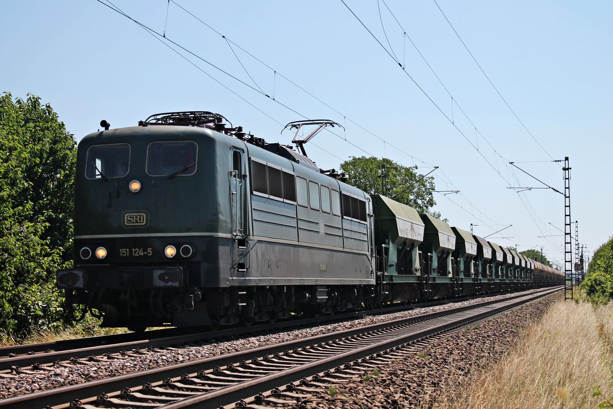Am 10.07.2015 bespannte SRI/SVG 151 124-5 einen leeren Schotterzug den sie von der Schweizer Grenze nach Bayern brachte. Hier ist der grüne Kraftprotz kurz hinter Müllheim (Baden) in Richtung Freiburg unterwegs. Tobias Schmidt