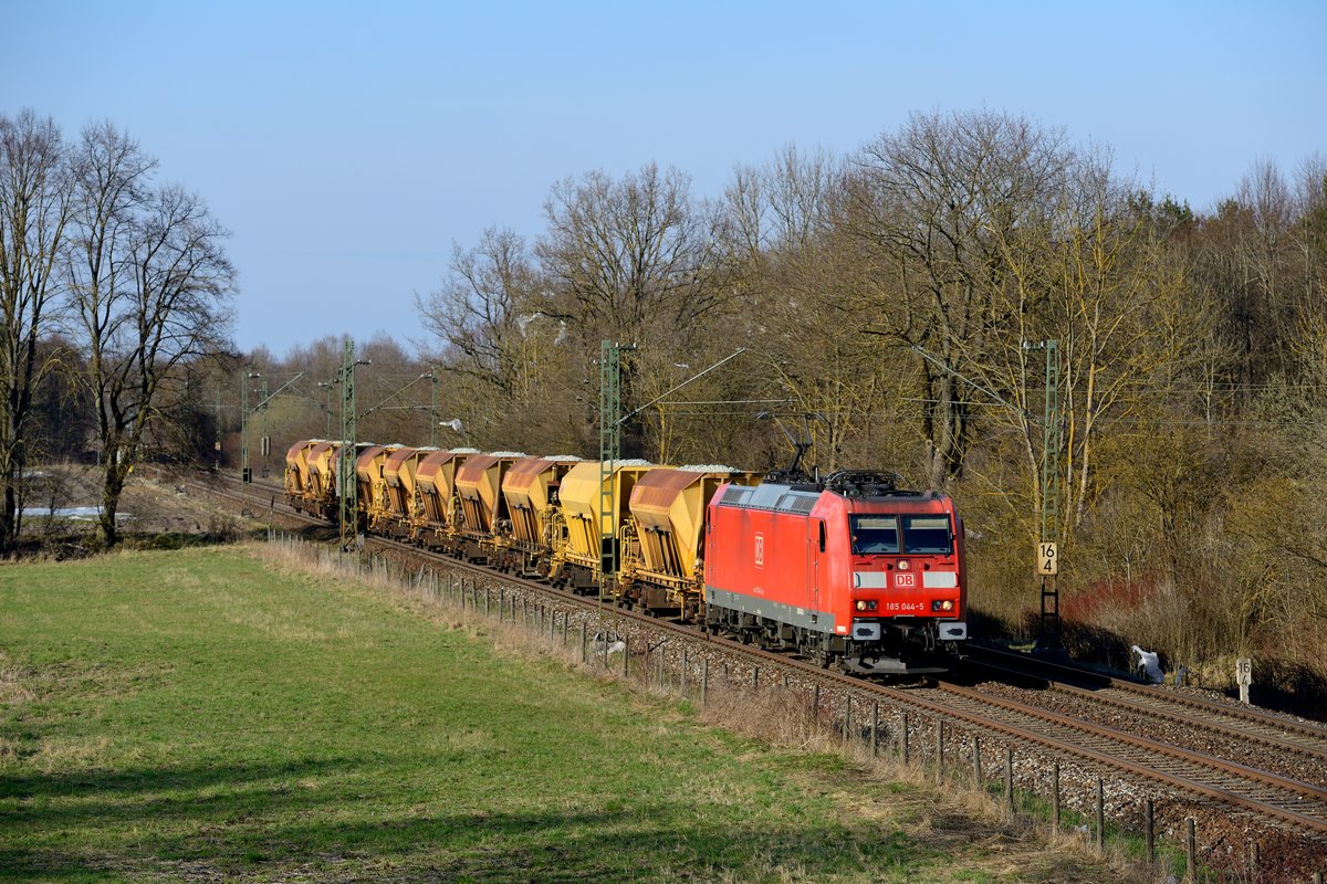 Häufig auf der KBS 930 zu beobachten sind die Schotterzüge von Vilshofen zu den jeweiligen Baustellen in Südbayern. Allerdings werden diese Züge natürlich nur bei Bedarf eingelegt. Am 11. April 2016 verkehrte beispielsweise ein GB 62724 nach München Süd, als Zuglok war 185 160 eingeteilt. Kurz bevor die Schatten ins Gleis wanderten, konnte die Leistung im Korbinaniholz bei Oberschleissheim abgelichtet werden. Christoph Schneider