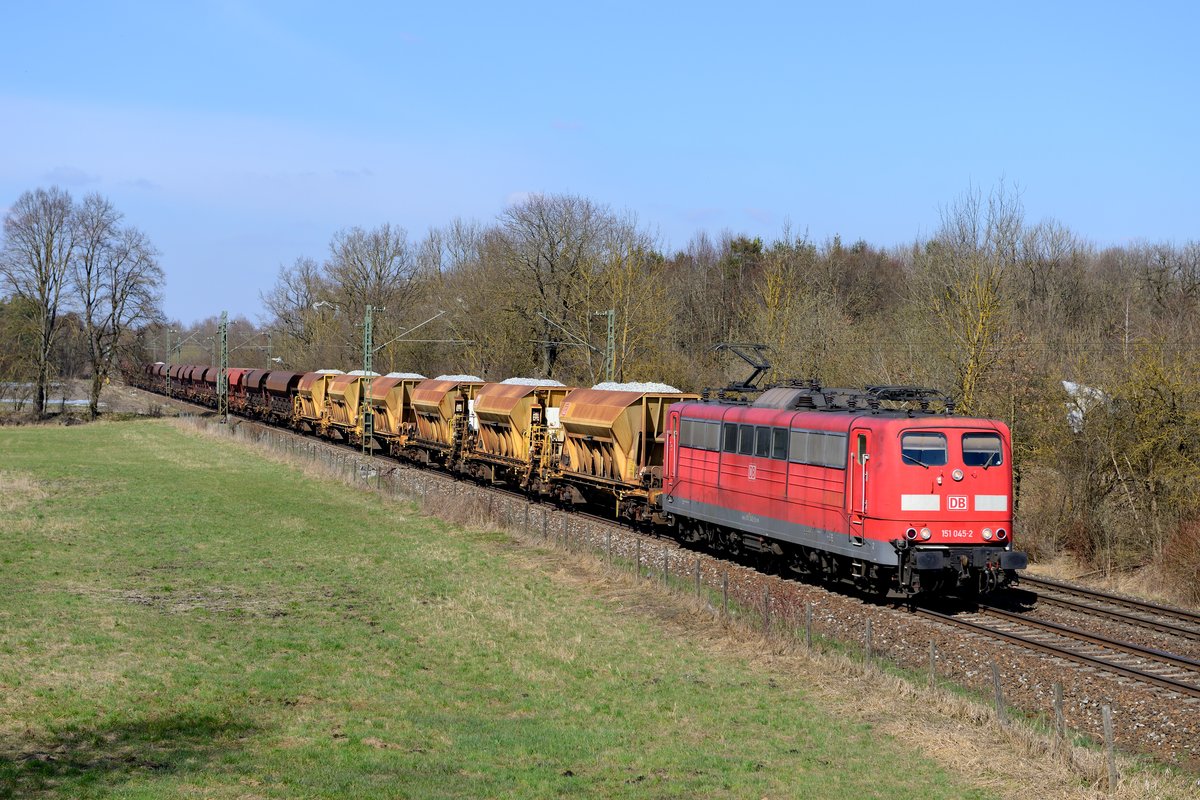 Häufiger auf der KBS 930 anzutreffen sind Ganzzüge von den Niederbayerischen Schotterwerken in Vilshofen zu den jeweiligen Baustellen in Südbayern. Eine solche Leistung verkehrte auch am 07. April 2015 und konnte bei Oberschleißheim fotografiert werden. Zuglok war die 151 045. Christoph Schneider
