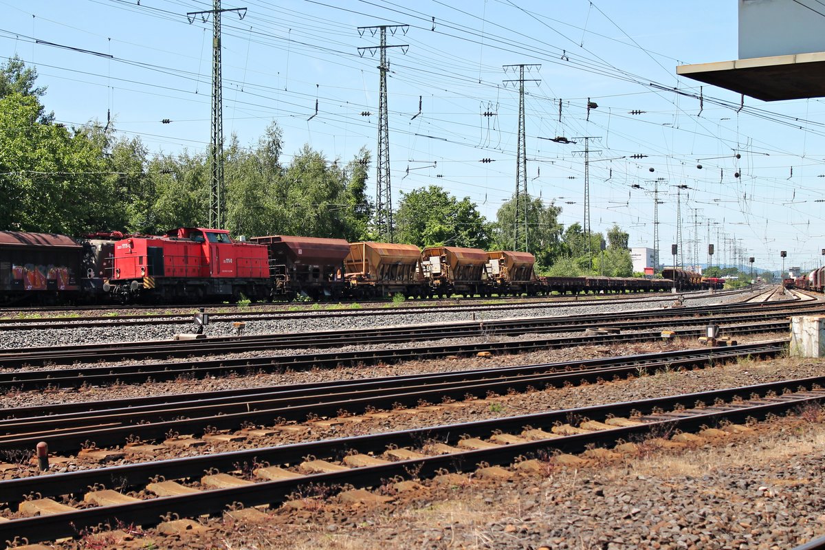 In Roßberg steht 232 569-4 auf dem Ladegleis, auf dem am 28.07.2016 die Schüttgutwagen vom Typ Falns durch ein Förderband mit Kies von der nahegelegenen Grube befüllt werden. Jürgen Vos