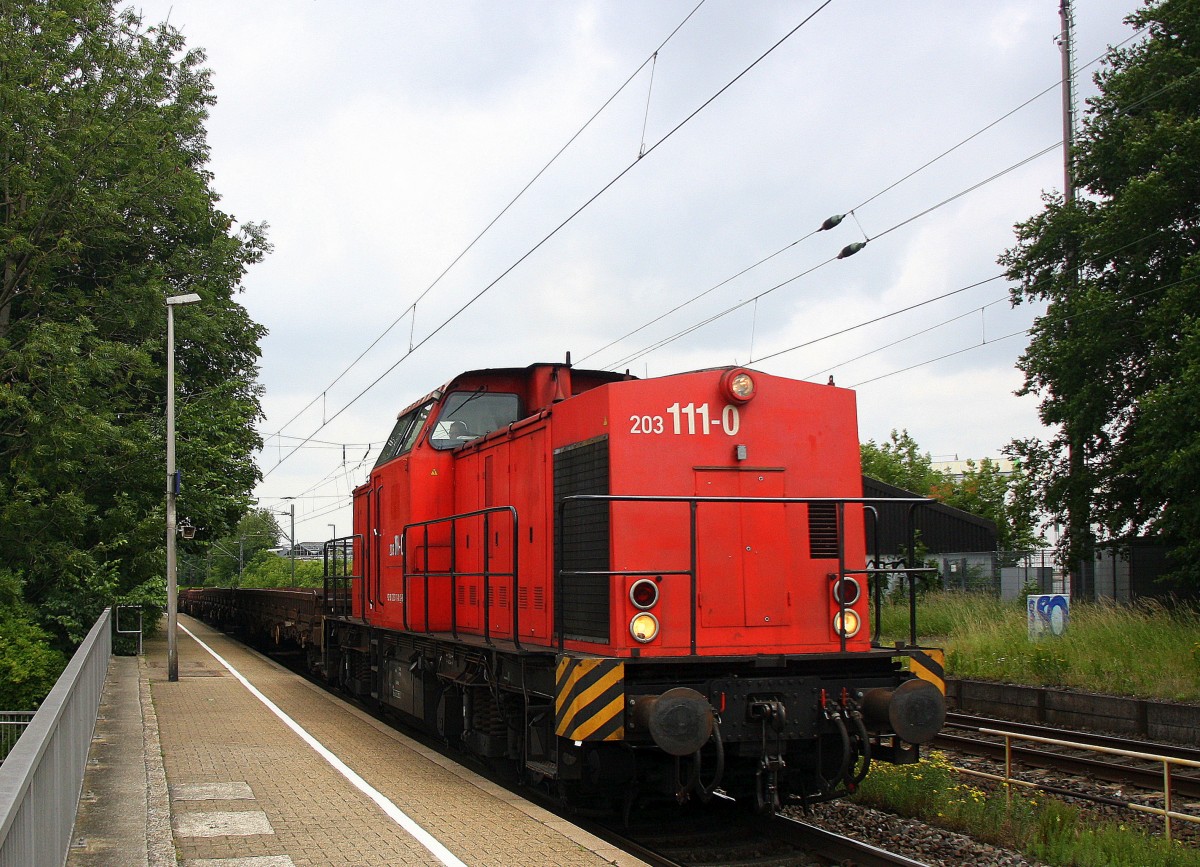 203 111-0 EBM Cargo kommt die Kohlscheider-Rampe hoch aus Richtung Herzogenrath mit einem langen Schotterleerzug aus Neuss nach Stolberg-Hbf(Rheinland) und fährt durch Kohlscheid in Richtung Richterich,Laurensberg,Aachen-West.