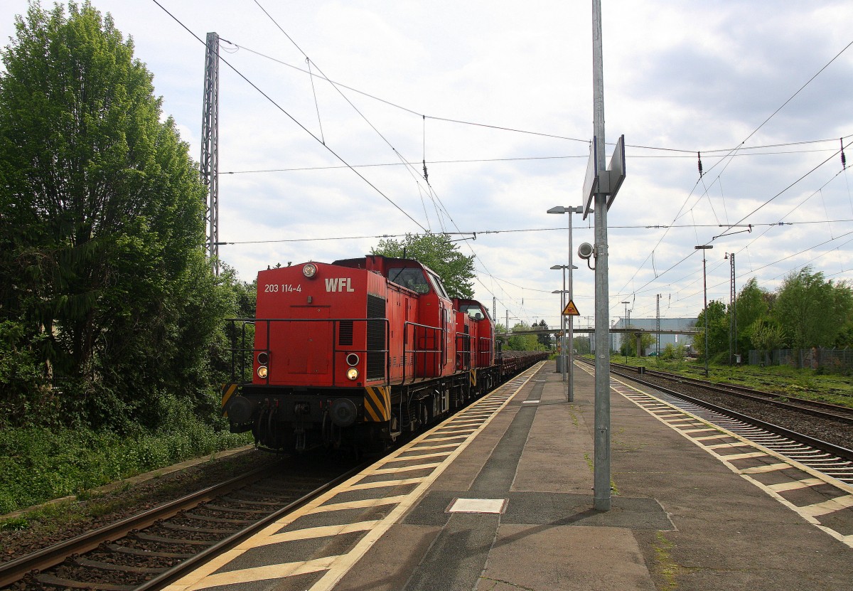 203 114-4 und 203 112-8 beide von der WFL kommen durch Bad-Honnef am Rhein mit einem langen Schotterzug aus Richtung Koblenz und fahren in Richtung Köln auf der rechten Rheinstrecke(KBS 465).