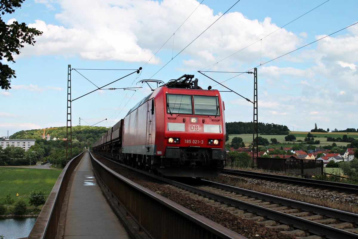 Schotterzüge sind hier an der Saar eher selten, es überwiegen die Kohlen-, Erz- und Stahlzüge. 185 223-5 durchfährt die Gerade zwischen dem Kraftwerk Ensdorf und dem Bahnhof Ensdorf in Richtung Mosel. Bahnstrecke 3230 Saarbrücken - Karthaus am 29.06.2013 Erhard Pitzius
