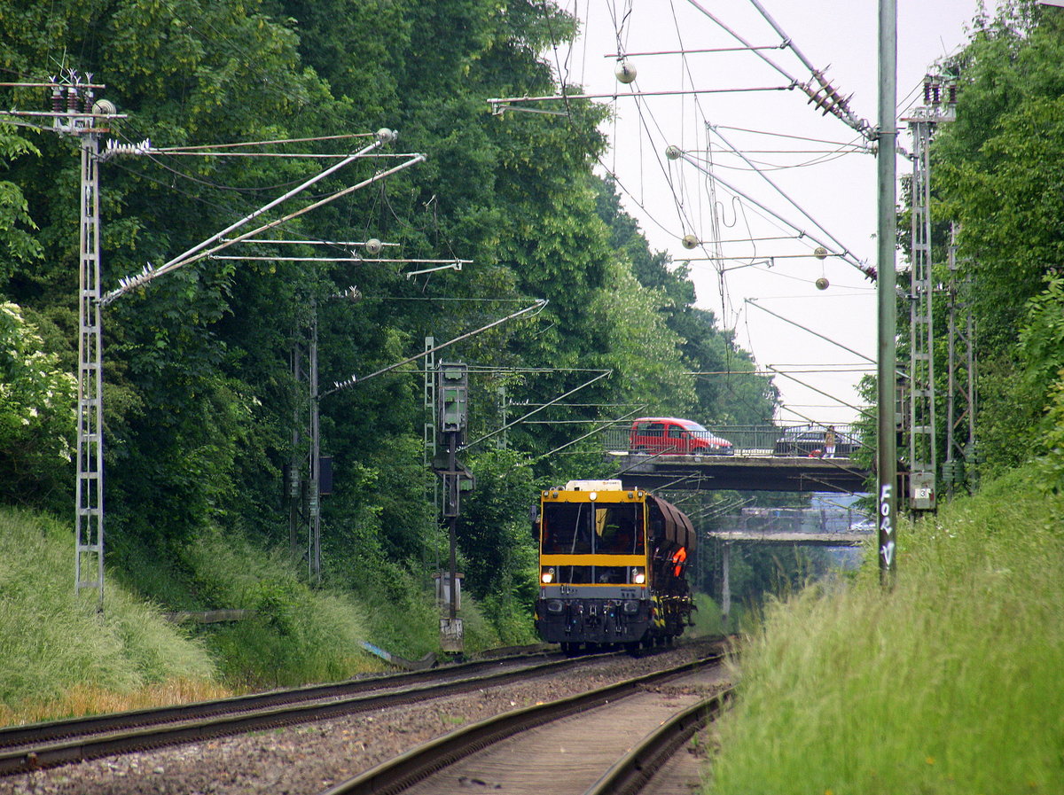 Ein Gleiskraftwagen mit einem Kurzen Schotterwagen kommt die Kohlscheider-Rampe hoch aus Richtung Neuss,Herzogenrath und fährt durch Kohlscheid in Richtung Richterich,Laurensberg,Aachen-West,Aachen-Schanz,Aachen-Hbf. Aufgenommen vom Bahnsteig 1 in Kohlscheid.