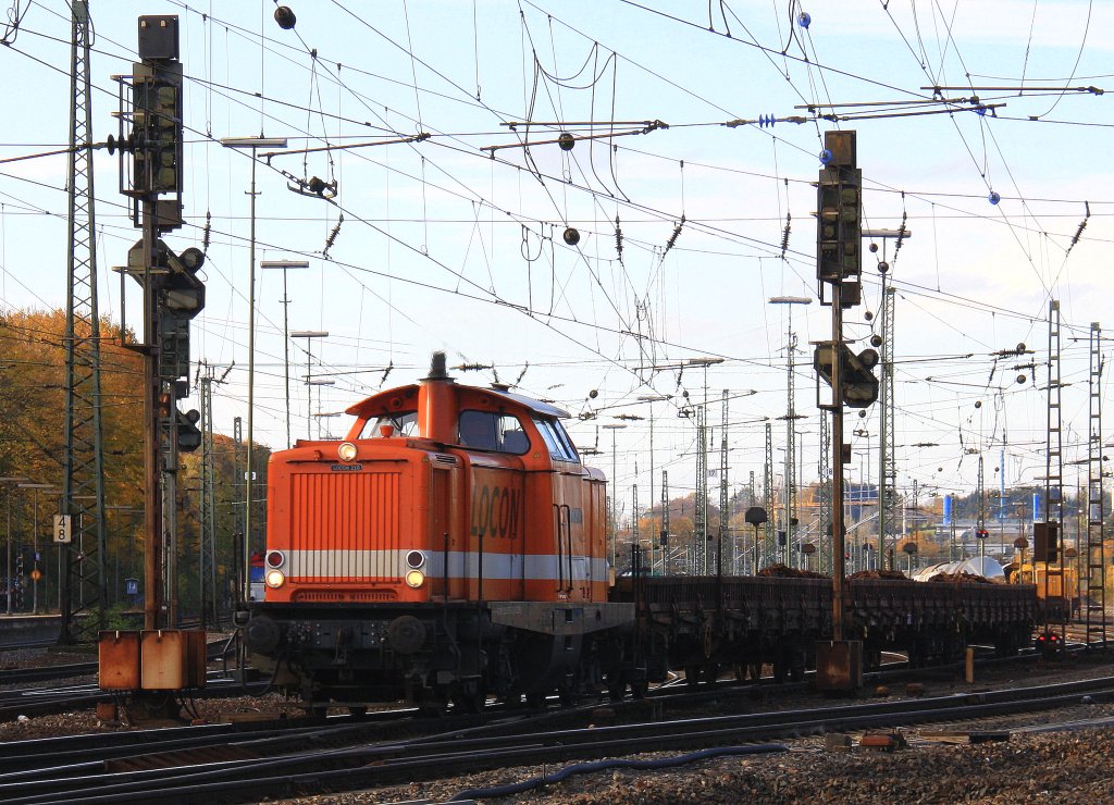 212 275-2 von Locon 210 fährt mit einem kurzen Schotterzug von Aachen-West nach Stolberg-Hbf(Rheinland) bei der Ausfahrt in Aachen-Wet und fährt in Richtung Aachen-Hbf bei schönem Sonnenschein am 9.11.2012. Stefan Hochstetter
