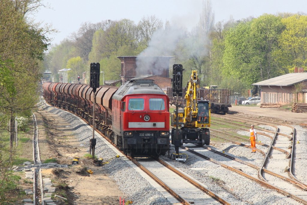 152 148-3 DB steht in Berlin-Flughafen-Schönefeld miit einem Schotterzug und wartet auf die Weiterfahrt in Richtung Potsdam bei Sonne und Wolken am 18.5.2012. Stefan Hochstetter