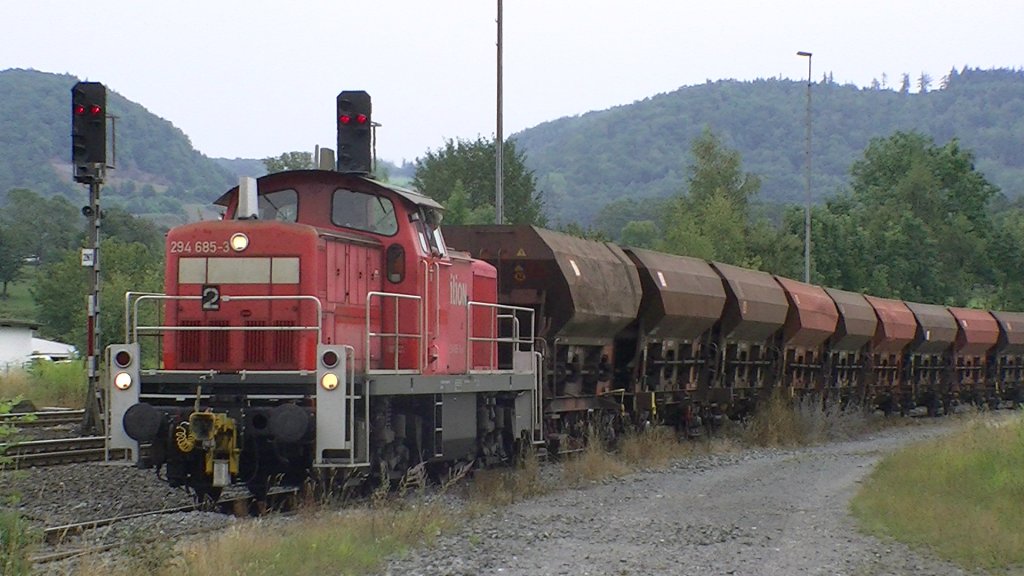 Hier seht ihr eine BR 294 mit einem Schotterzug in Untersteinach bei Stadtsteinach. Diese holt täglich Schotter ab. Meistens fährt diese auch nach Stadtsteinach, heute, 29.07.2011, hatte sie nur wenige Wagen dabei und so konnte sie in Untersteinach beladen werden. Alexander