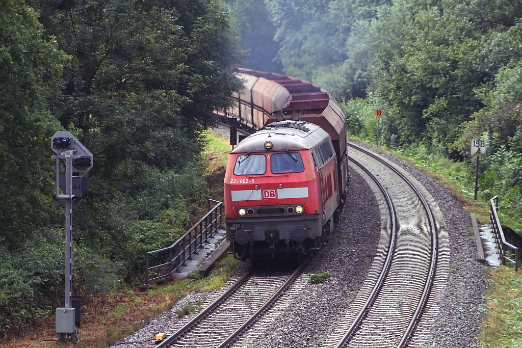 GM 61815 (Roßberg-Friedrichshafen) auf den letzten Metern vor dem Ziel, Friedrichshafen Güterbahnhof. Hier zeiht 225-802 den Kieszug, aufgenommen am Haltepunkt "Friedrichshafen Flughafen" (1.08.2012) mathias