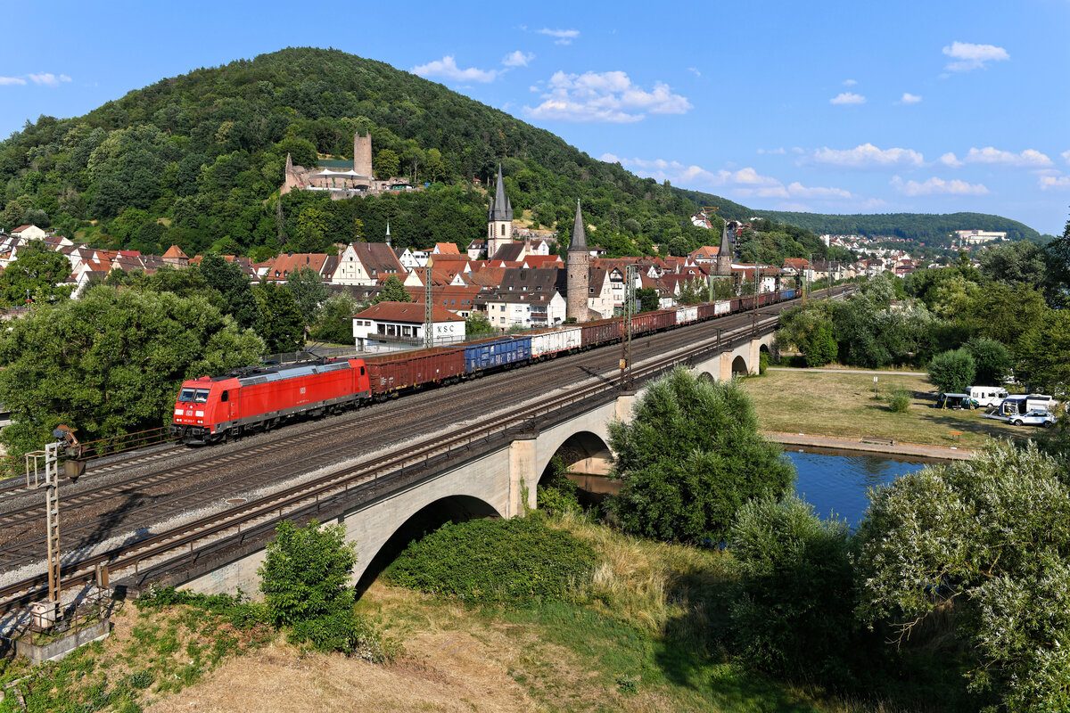 Am Nachmittag des 11. Juli 2023 war die Nord-Süd-Strecke längere Zeit gesperrt und die Züge mussten mit Ausnahme des Regionalverkehrs über Aschaffenburg umgeleitet werden. Erster wieder regulär verkehrender Zug war ein Ganzzug, bestehend aus Waggons der Gattung Eaos. Zuglok war die 185 203 von DB Cargo. Bei Gemünden am Main gelang eine Aufnahme.