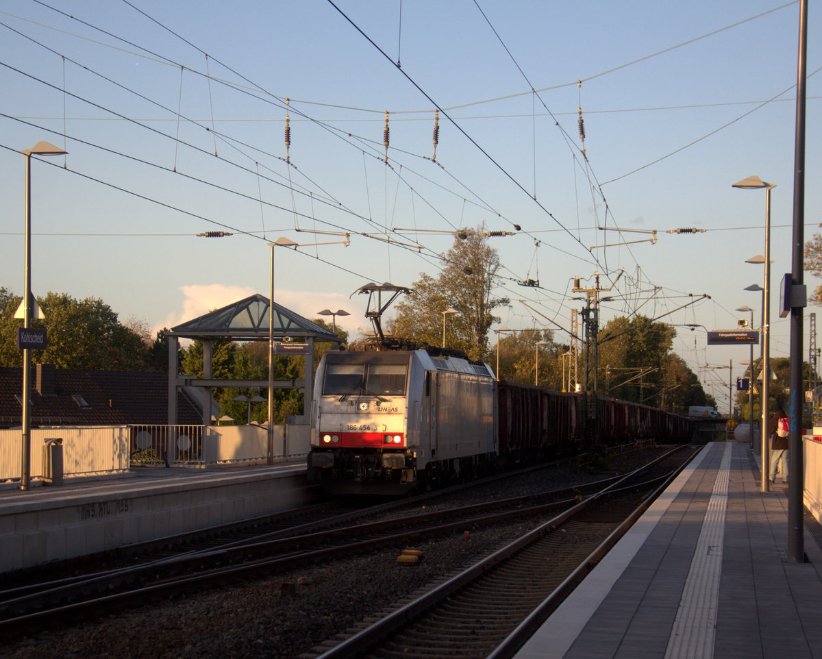 186 454-5 von Lineas kommt die Kohlscheider-Rampe hoch aus Richtung Neuss,Herzogenrath als Umleiter mit einem Schrottzug aus Köln-Kalk(D) nach Genk-Goederen(B) und fährt durch Kohlscheid in Richtung Richterich,Laurensberg,Aachen-West. Aufgenommen vom Bahnsteig 1 in Kohlscheid. Bei schönem Sonnenschein am Abend vom 18.10.2019.