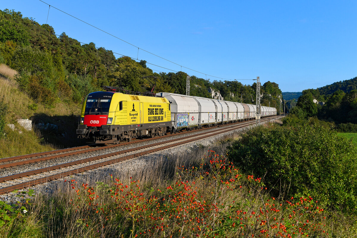 Am 25. September 2023 konnte ich den RCC Ganzzug von Kiefersfelden nach Nordhausen bei Hagenacker im Altmühltal fotografieren. Mit dieser Leistung wird Kalkstein zu einem Zementwerk transportiert. Passend zum Zug kam an diesem Tage die 1016.020 davor zum Einsatz. Der Taurus wirbt für Ausbildungsberufe im Bauhilfsgewerbe. Christoph Schneider
