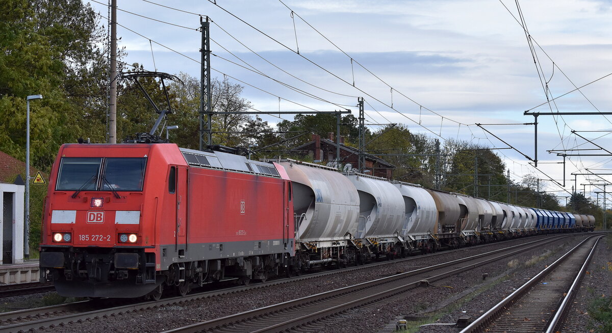 DB Cargo AG, Mainz mit ihrer "185 272-2" (NVR: "91 80 6185 272-2 D-DB") und einem Staubgutzug am 07.11.23 Höhe Bahnhof Niederndodeleben. Lothar Stöckmann