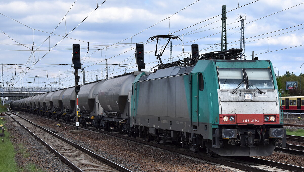 Transchem Sp. z o.o., Włocławek [PL] mit der polnischen ATLU Lok "E 186 243-2" [NVR-Nummer: 91 51 5270 001-8 PL-ATLU] und einem Staubgutzug am 23.04.24 Höhe Bahnhof Schönefeld bei Berlin. Lothar Stöckmann