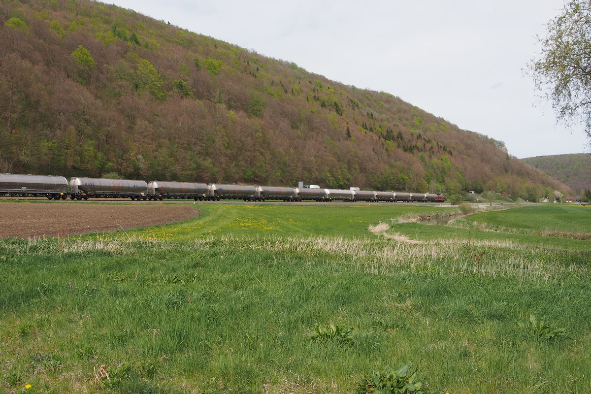 212 309 hat an diesem Nachmittag einen leeren Braunkohlenstaub-Zug am Haken, um ihn vom Bahnhof Schelklingen nach Ulm zu überführen. 24. April 2019, 14:48 Uhr