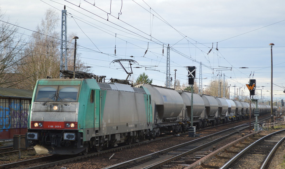 Die polnische Transchem Sp. z o.o., Włocławek [PL] mit "E 186 243-2" [NVR-Nummer: 91 51 5270 001-8 PL-TM] und einem Ganzzug Staubgutwagen Richtung Polen am 28.11.19 Berlin Hirschgarten.