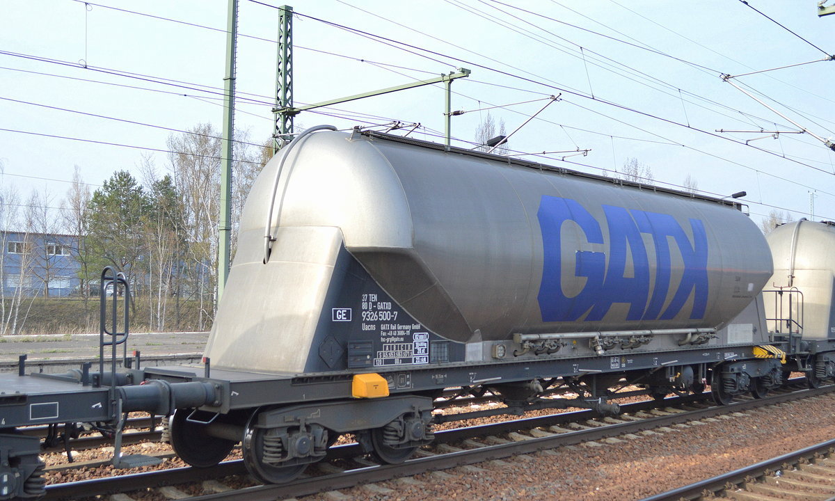 Drehgestell-Staubgutwagen vom Einsteller GATX Germany mit der Nr. 37 TEN 80 D-GATXD 9326 500-7 Uacns in einem Ganzzug am 05.04.19 Bf. Flughafen Berlin-Schönefeld.